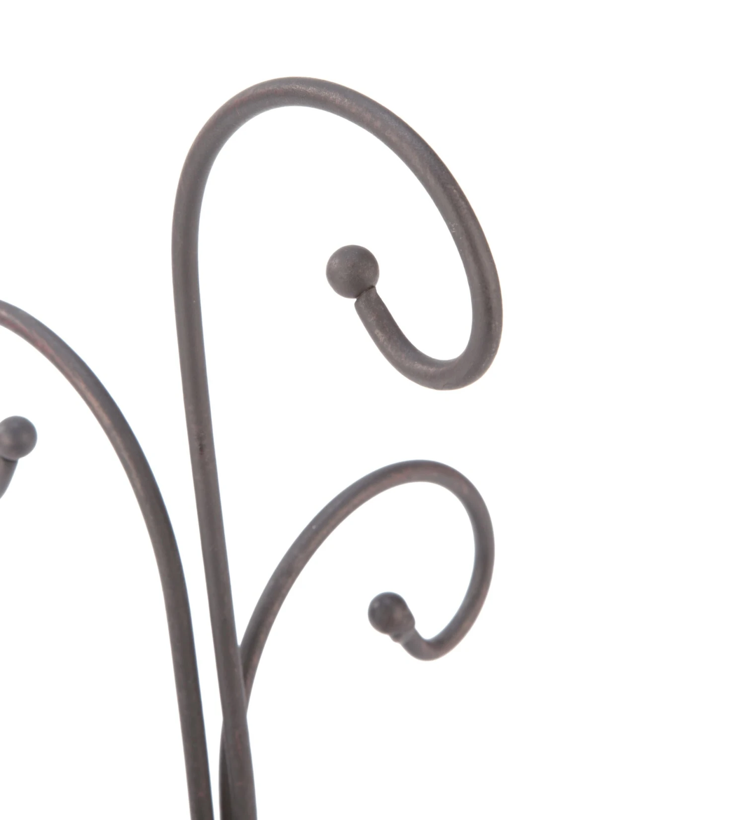 Display your favorite mugs while keeping countertops clutter-free with the simple and sturdy 4-Arm Mug Stand. Made of metal with a mahogany painted finish, this piece is 16″ tall and accentuates any space! The piece features 4 arms that swirl inward to hold glassware in place. The design of sleek curves and swirls make this mug tree a truly attractive addition to your kitchen’s countertop space.