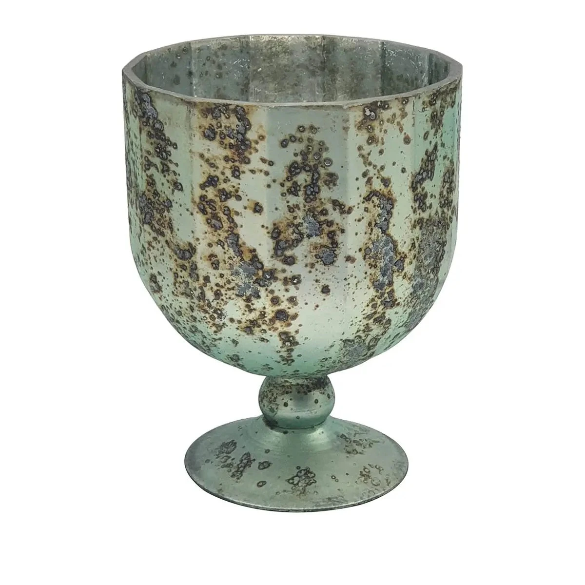 The beveled surface of this Chalice creates the ideal surface to reflect the beauty of mercury glass with and aged finish.