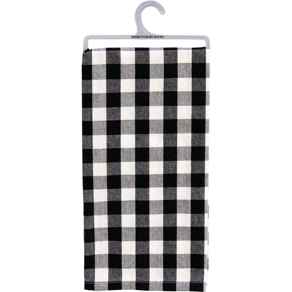 A cotton kitchen towel featuring an all-over small black and buff white buffalo check pattern. Machine-washable.