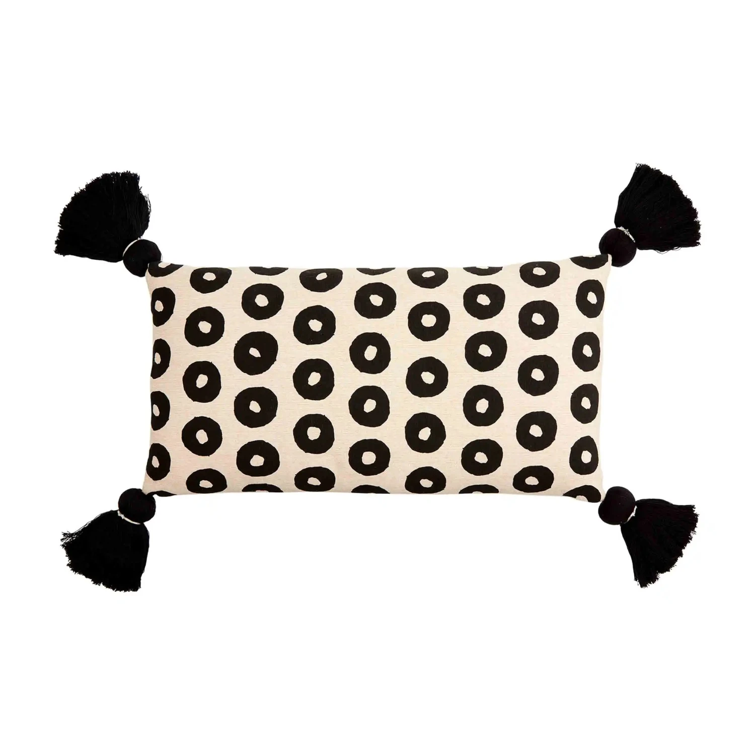 Our Lumbar Black Dot Tassel Pillow is a classy piece for your home. The chambray pillow features yarn tassel corners. The pillow has a zipper closure. The pillow arrives with an insert that is vacuum-sealed and located inside the pillow cover.