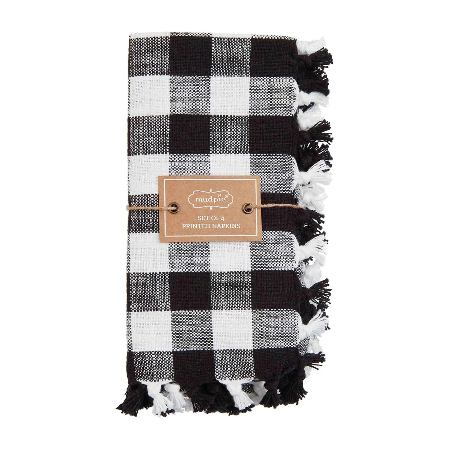 This Black Gingham Napkin Set is a classic and cohesive decorative set for your dining table. The set comes with four cotton dinner napkins. The napkins each feature a fringe tassel trim. This is a great every day set!