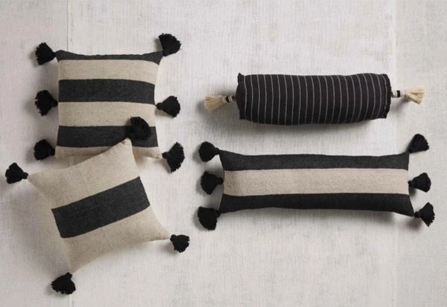 Ponchaa pillow features tassel ends, canvas backing and zipper closure.