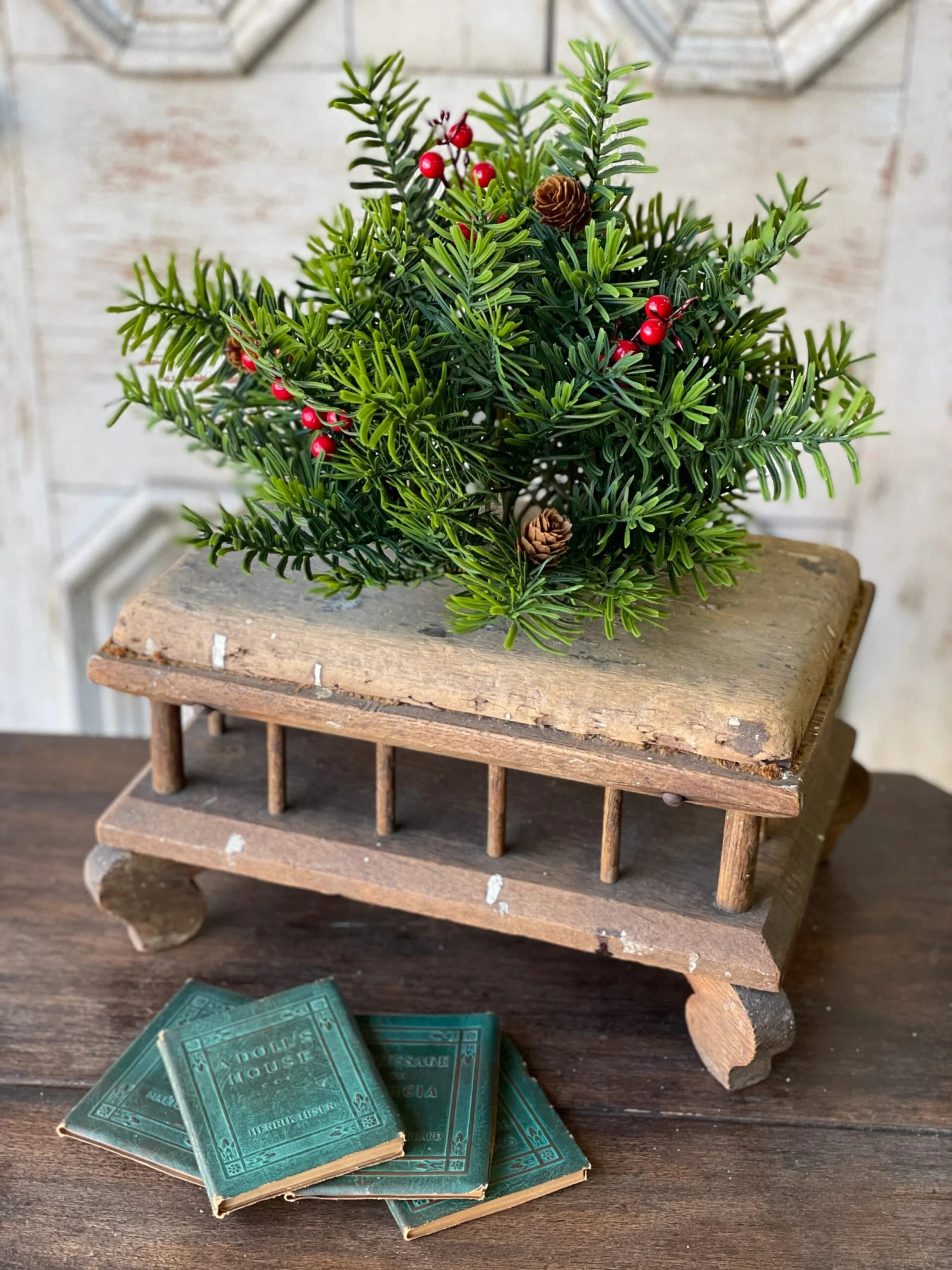 A beautiful background of fringed greenery sets the perfect stage for bold berries and small pine cones.