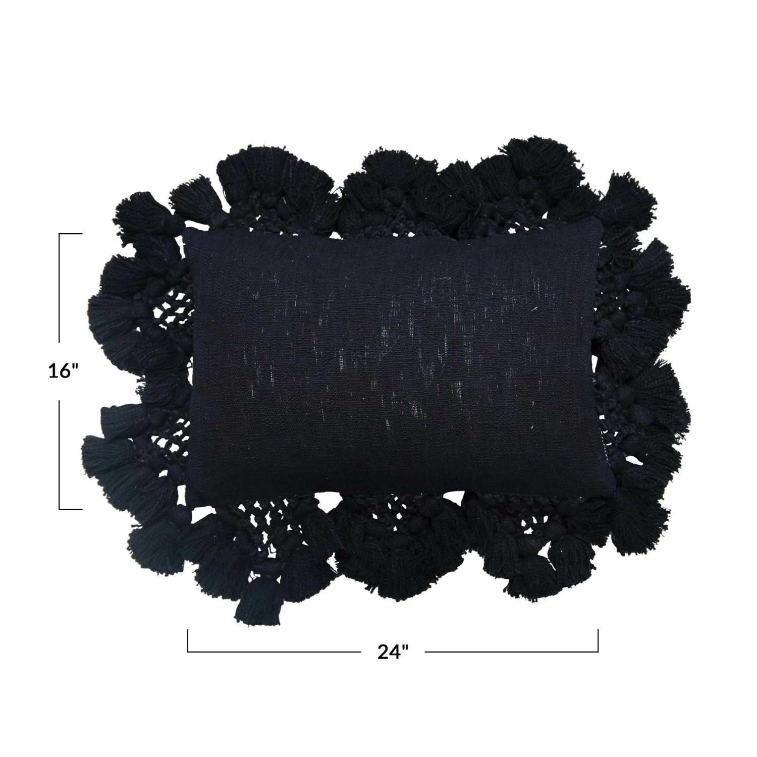 Cotton Slub Lumbar Pillow With Crochet & Tassels, Black