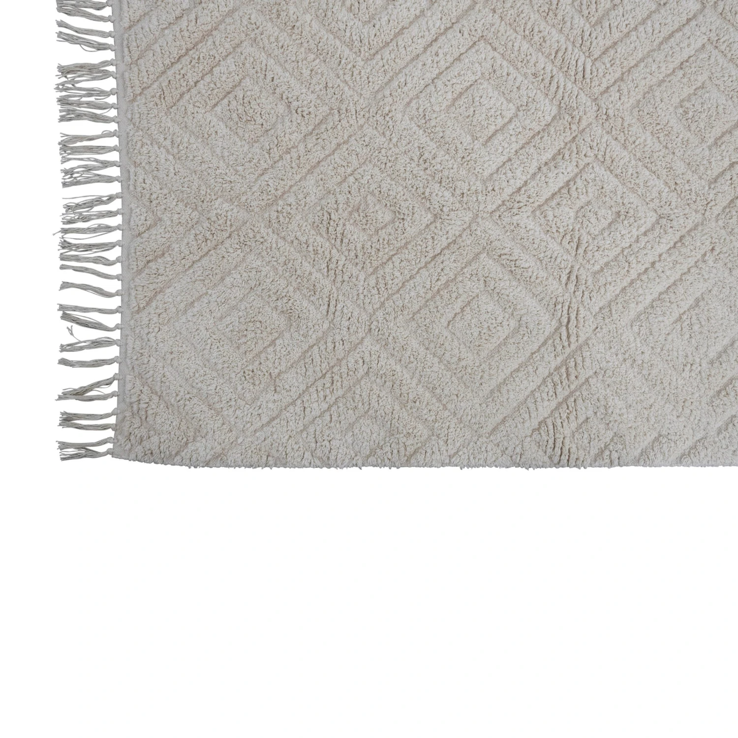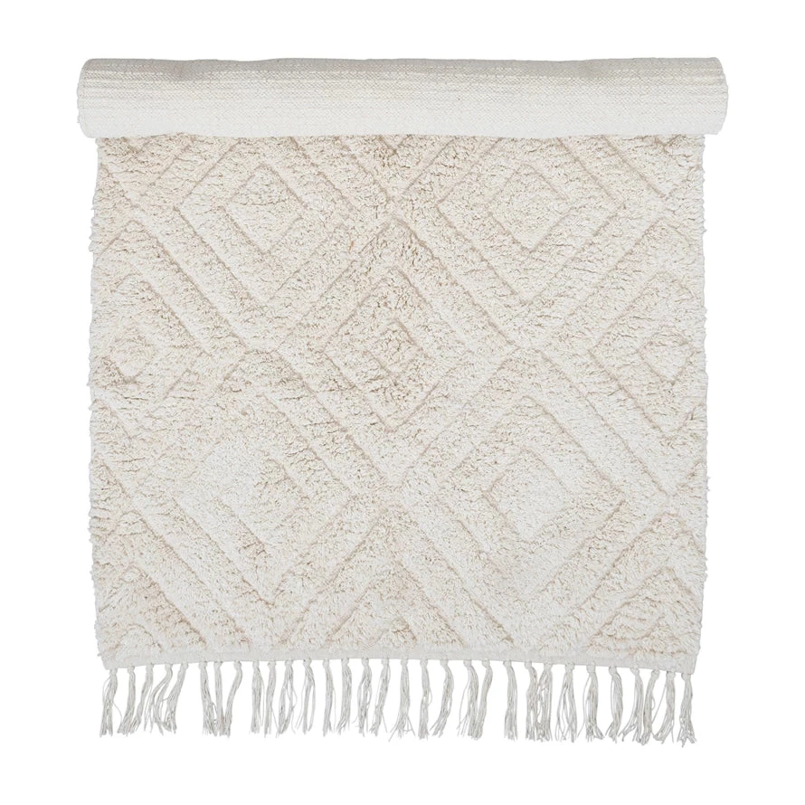Cotton Tufted Rug With Diamond Pattern & Fringe, Cream (Pick Up Only)