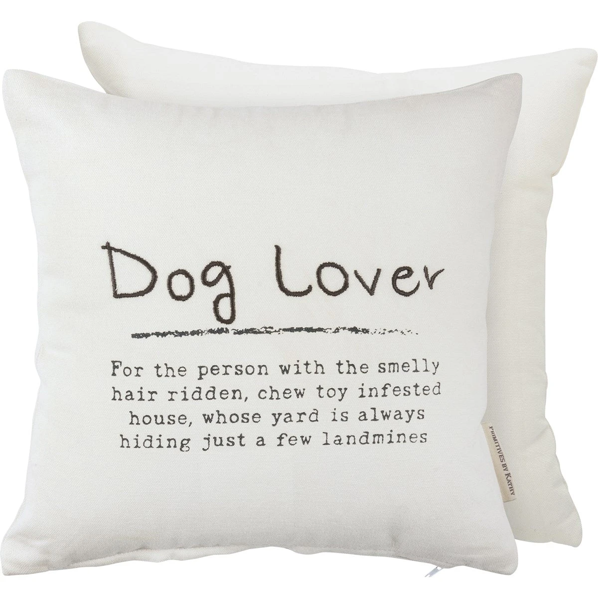 A cream cotton pillow whichfeatures an embroidered “Dog Lover” sentiment followed by a themed poem. Polyester filling. Includes a zipper to easily remove and clean cover.