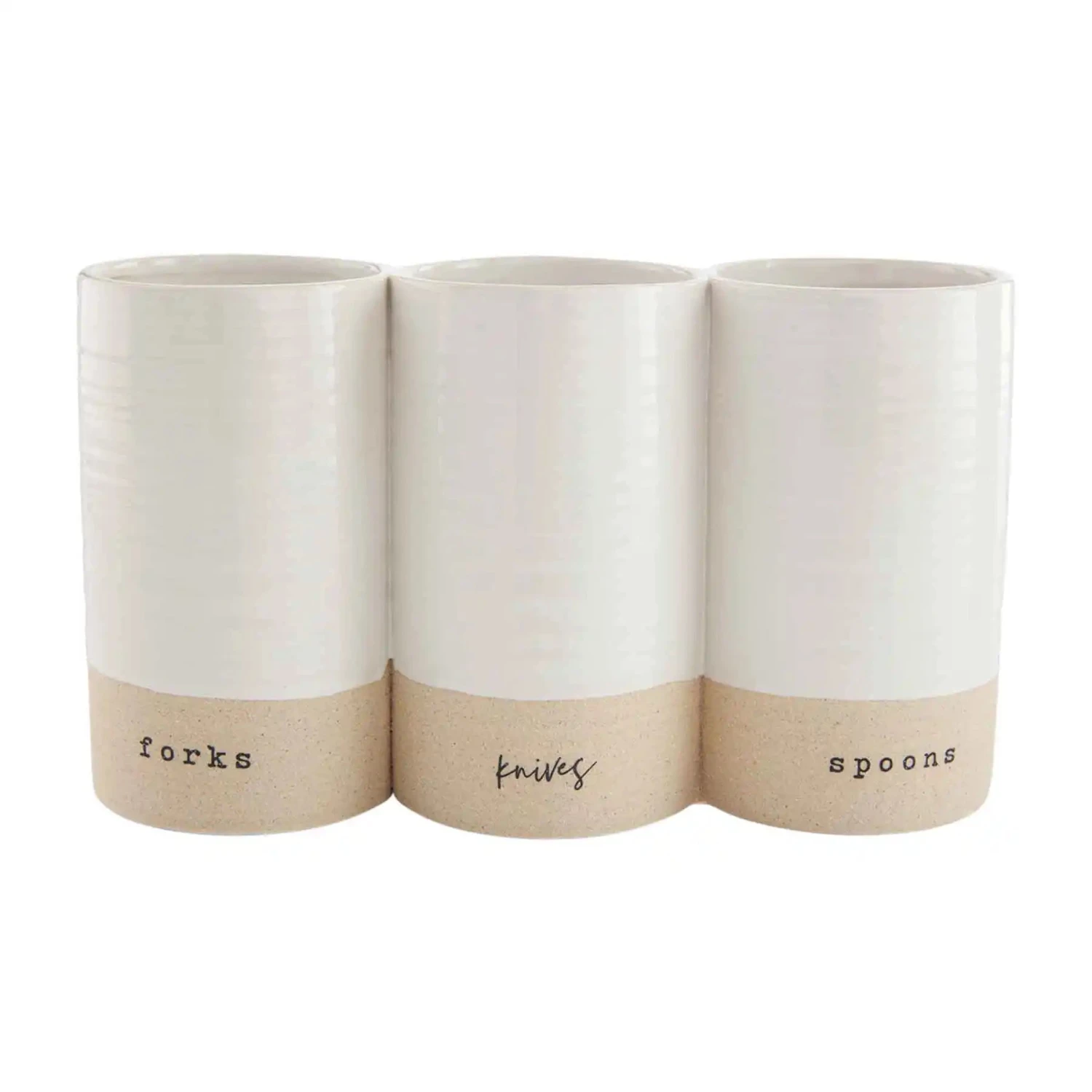 Make sure your summer gatherings are even more organized with our Farmstead Utensil Caddy. The stoneware utensil caddy features three-sections. The caddy features places for forks, knives and spoons with each sectioned being labeled for it. Hand wash this as needed.