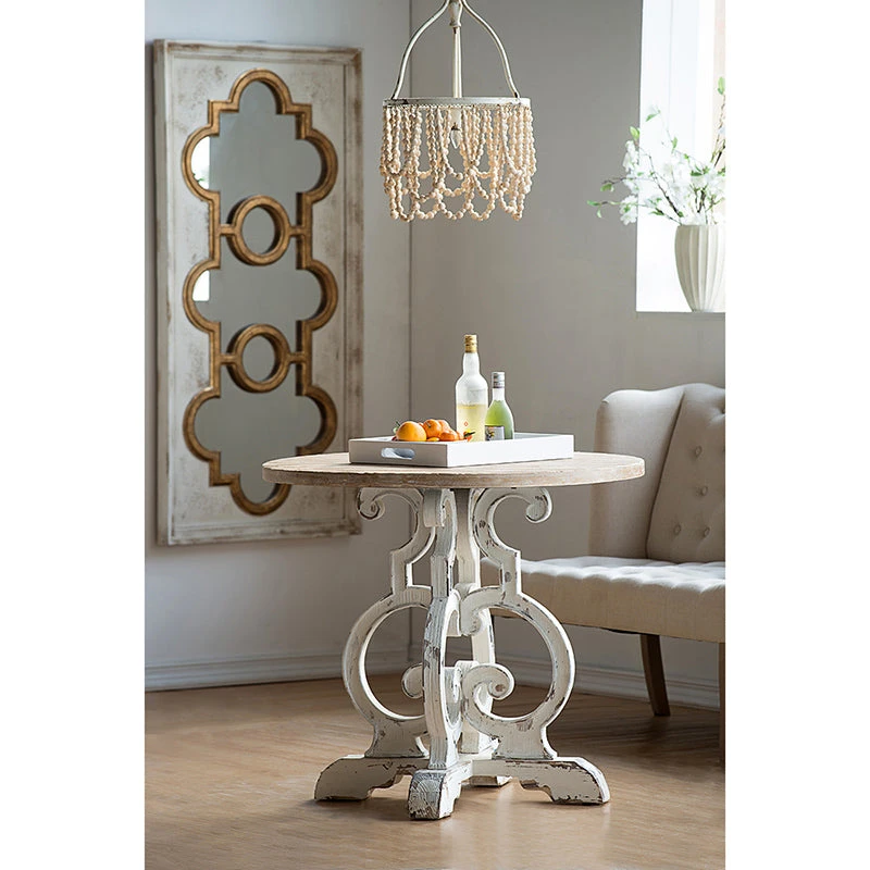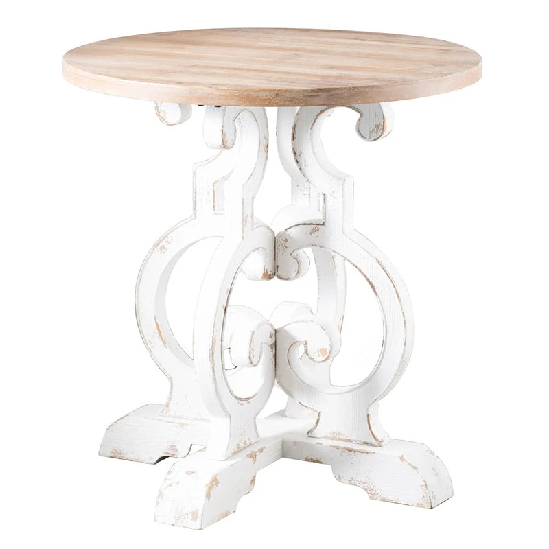 Crafted for versatility this French chic table instantly updates any interior with its spin on French chic style. Finished in a white palette, it’s smooth circular top is paired with a sculptural wood base for a signature designer touch.Classic combination of antique white and natural wood. Simple and elegant look to complement any decor. Smaller size for versatile use.