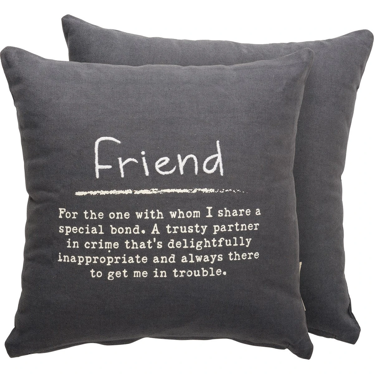 A gray cotton pillow featuring an embroidered “Friend” sentiment followed by a themed poem. Polyester filling. Includes a zipper to easily remove and clean cover.