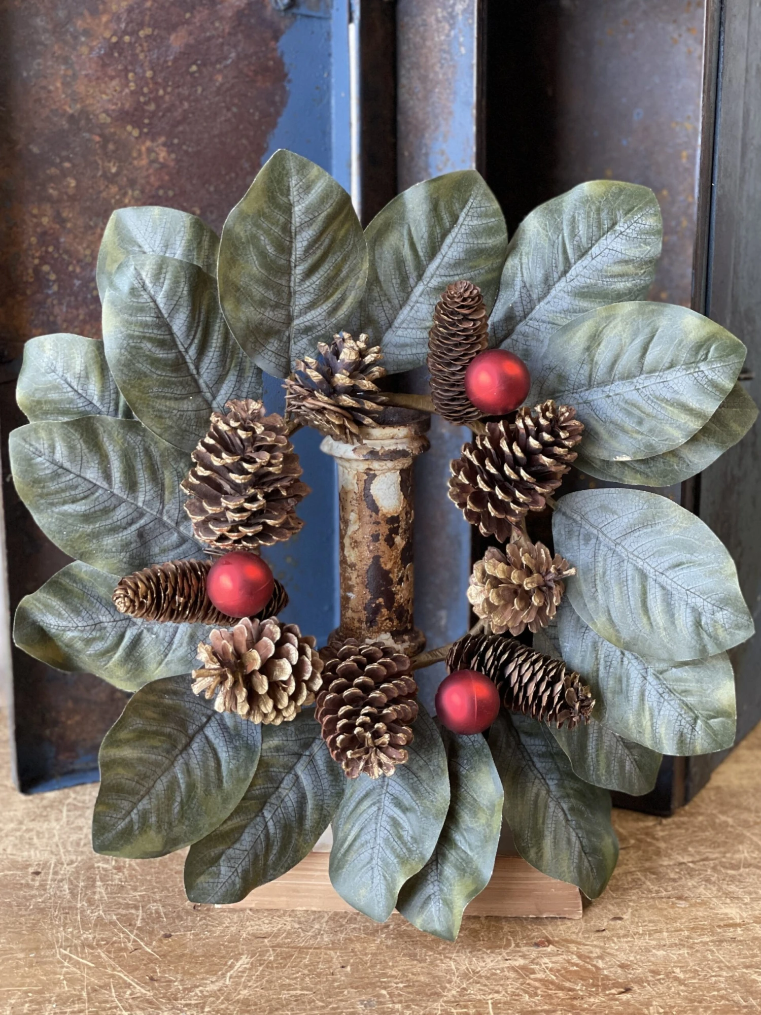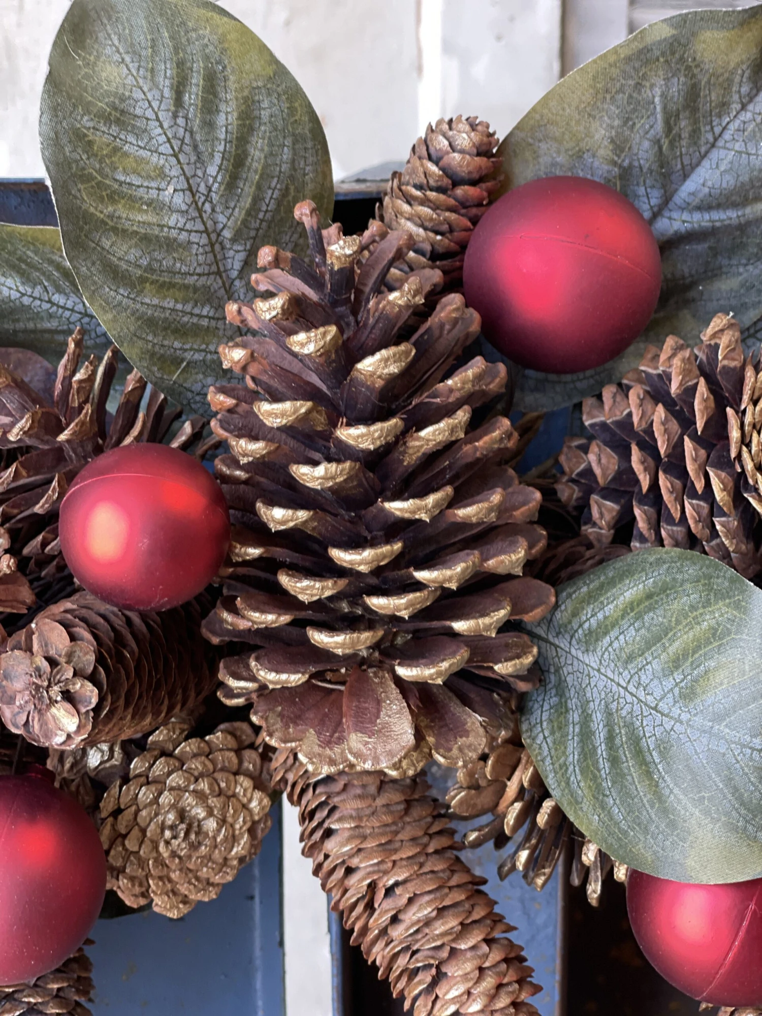 A collection sure to add a sense of grandeur to your holiday decor. Features magnolia, varying sizes of gold tipped pine cones, and red spheres.