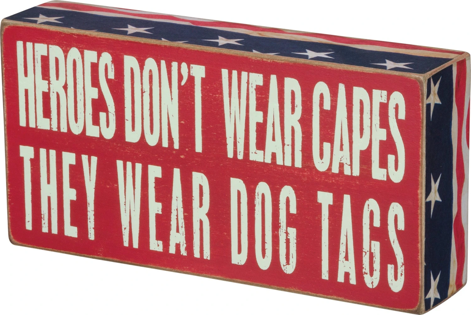 A red, white, and blue wooden box sign featuring a distressed “Heroes Don’t Wear Capes – They Wear Dog Tags” sentiment with stars and stripes side trim designs. Easy to hang or can free-stand alone.