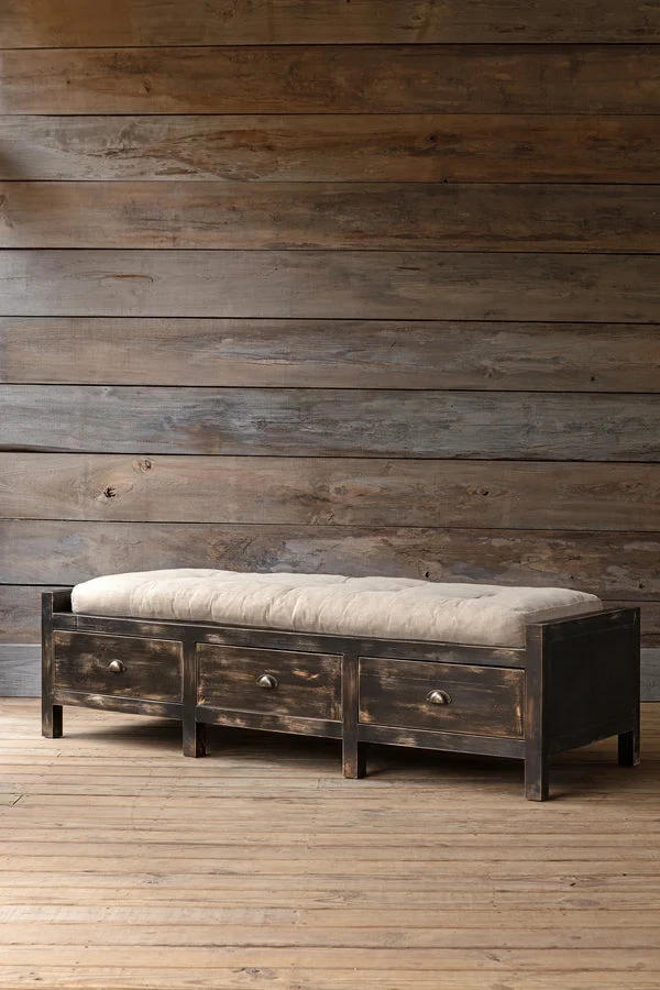 The perfect mudroom bench, our Hillsborough Boot Bench has three drawers for storage and a nice upholstered cushion.