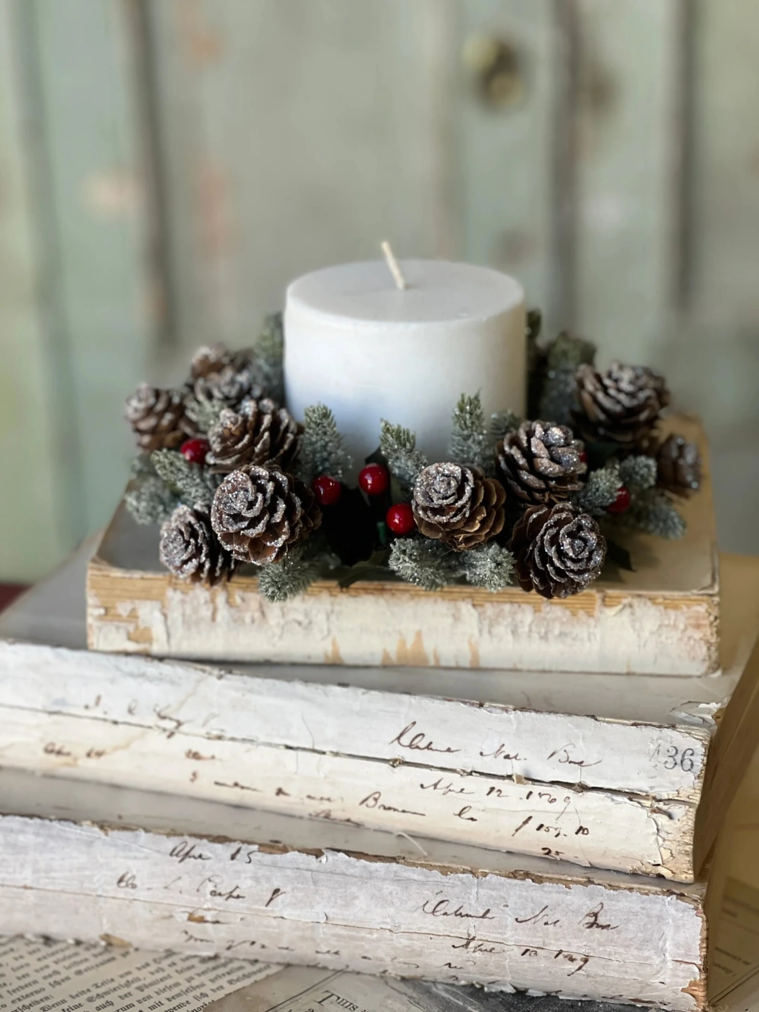 Popular and petite, the Icy Berries & Cone collection is a beautiful mix of pine, pine cones, red berries, and holly shaped leaves dusted with snow, glitter and mica for a wonderfully wintry effect.
