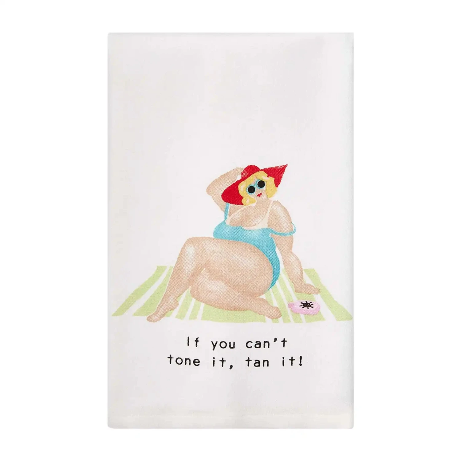 Get ready for summer with this can’t tone it, tan it hand towel. This printed cotton hand towel features the sentiment “If you can’t tone it, tan it!” The hand towel features an image of a woman sitting on a beach towel.