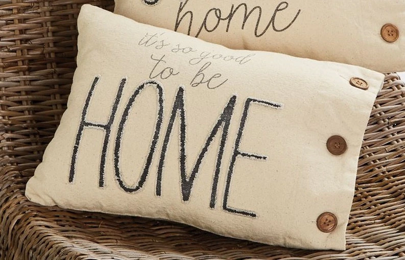 Printed canvas pillow features frayed washed canvas applique and wooden button detail.