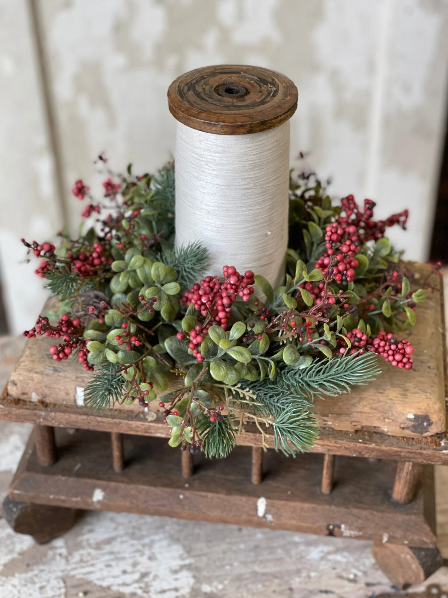 A wonderful assembly of spruce and greenery, pine cones, bubble berries and branching accents.
