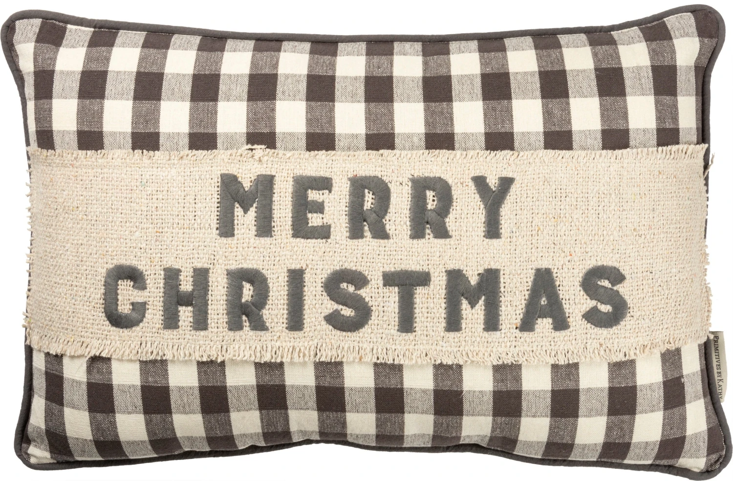 A farmhouse-inspired cotton pillow featuring an embroidered “Merry Christmas” sentiment, panel stitched jute accent, checkered background print, and piped trim.