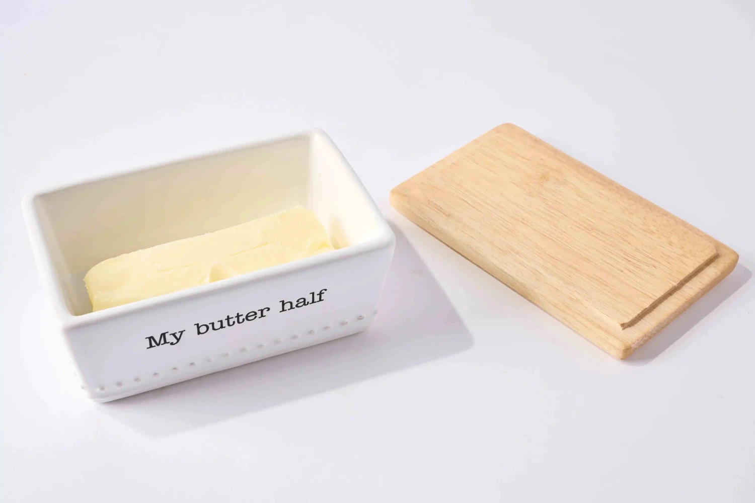 Add this My Butter Half Butter Dish set to your family dinner table. The two piece set comes with a debossed ceramic butter dish that reads “My butter half”. The butter dishes features wood lid that has a cut-out well to hold included silver-plate spreader. The spreader reads “pat on the back.”