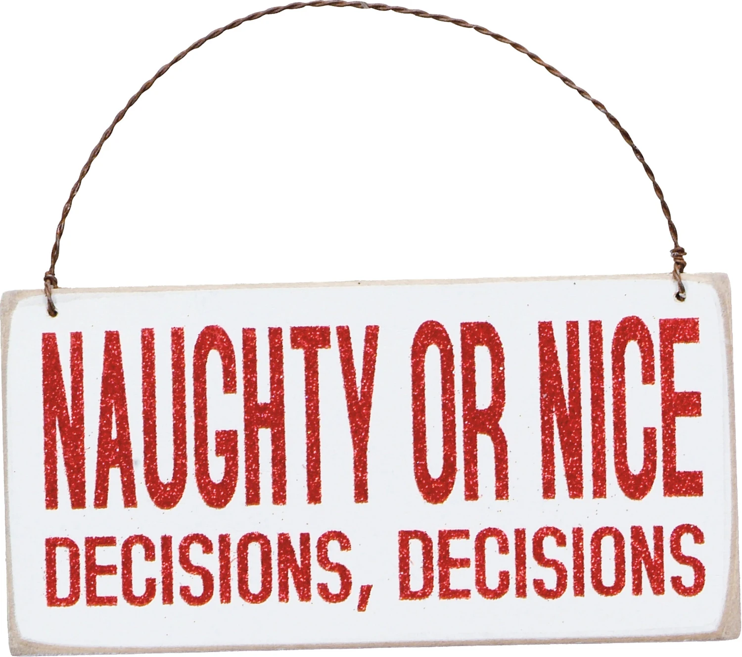 A wooden box sign plaque featuring a “Naughty Or Nice – Decisions, Decisions” sentiment in red glitter details. Contains twisted top wire loop for easy hanging.