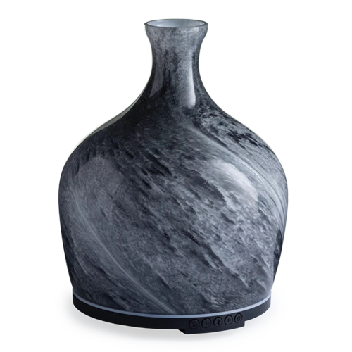 Marbled white swirls flow through black hand-blown glass to gently highlight the glow of light.