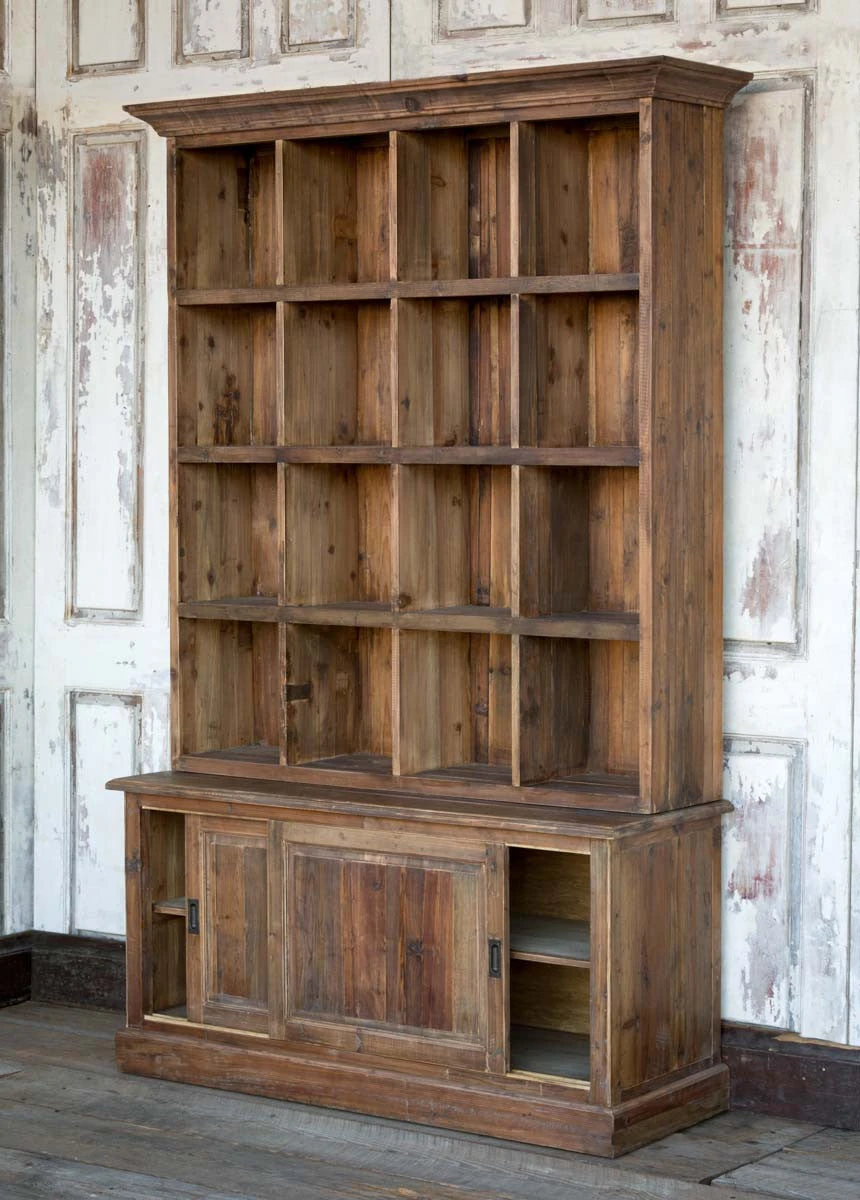 This two-piece old pine cabinet features 16 display sections topped with crown moulding in addition to lower cabinets with an inner shelf and sliding doors.