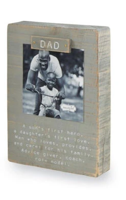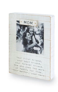Washed wood block frame features printed sentiment and holds photo with printed sentiment wood magnet with accent studs.