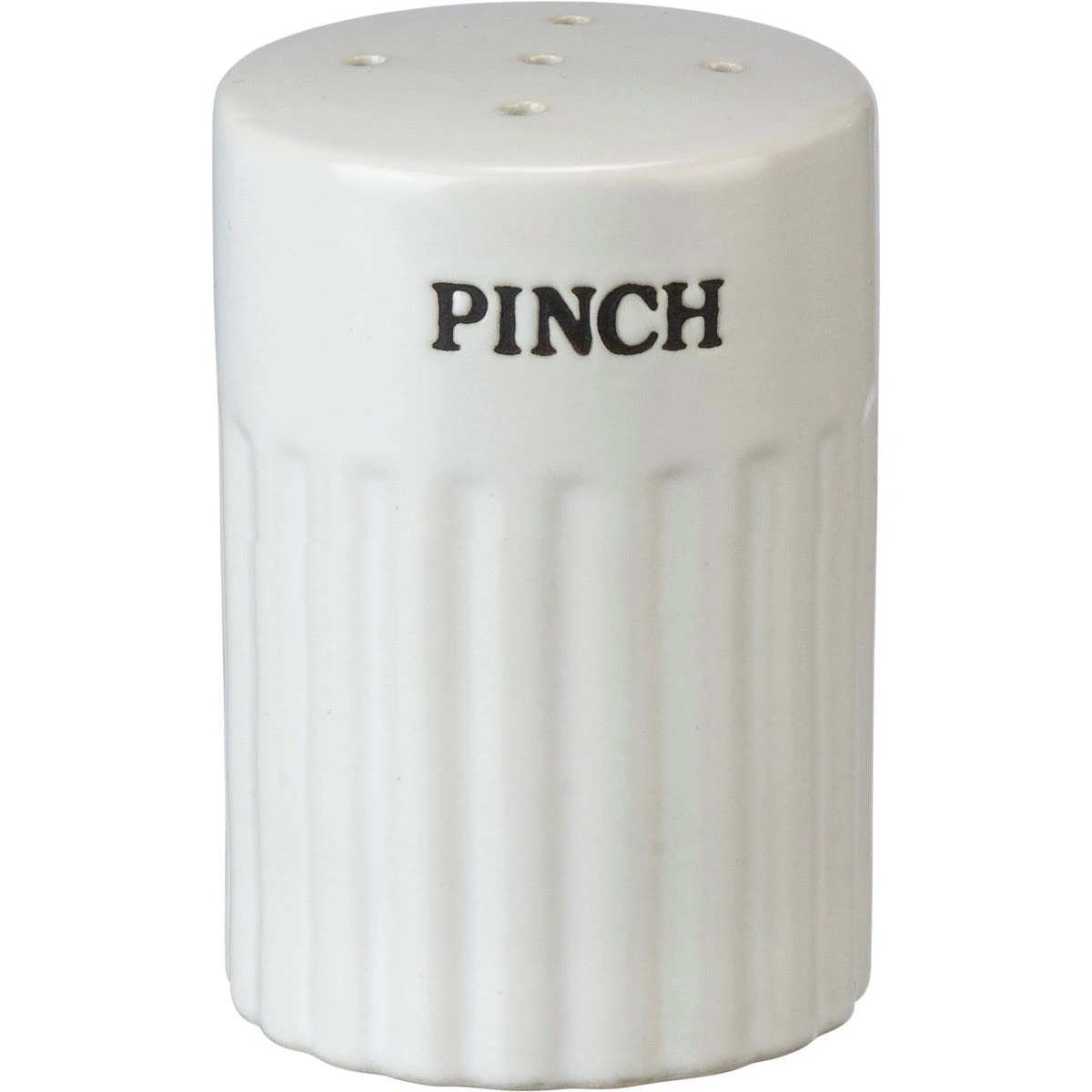 A set of white stoneware salt and pepper shakers lending debossed “Pinch” and “Dash” sentiments, respectively. Features ribbed texture and slate gray text microwave, oven, dishwasher and food safe.
