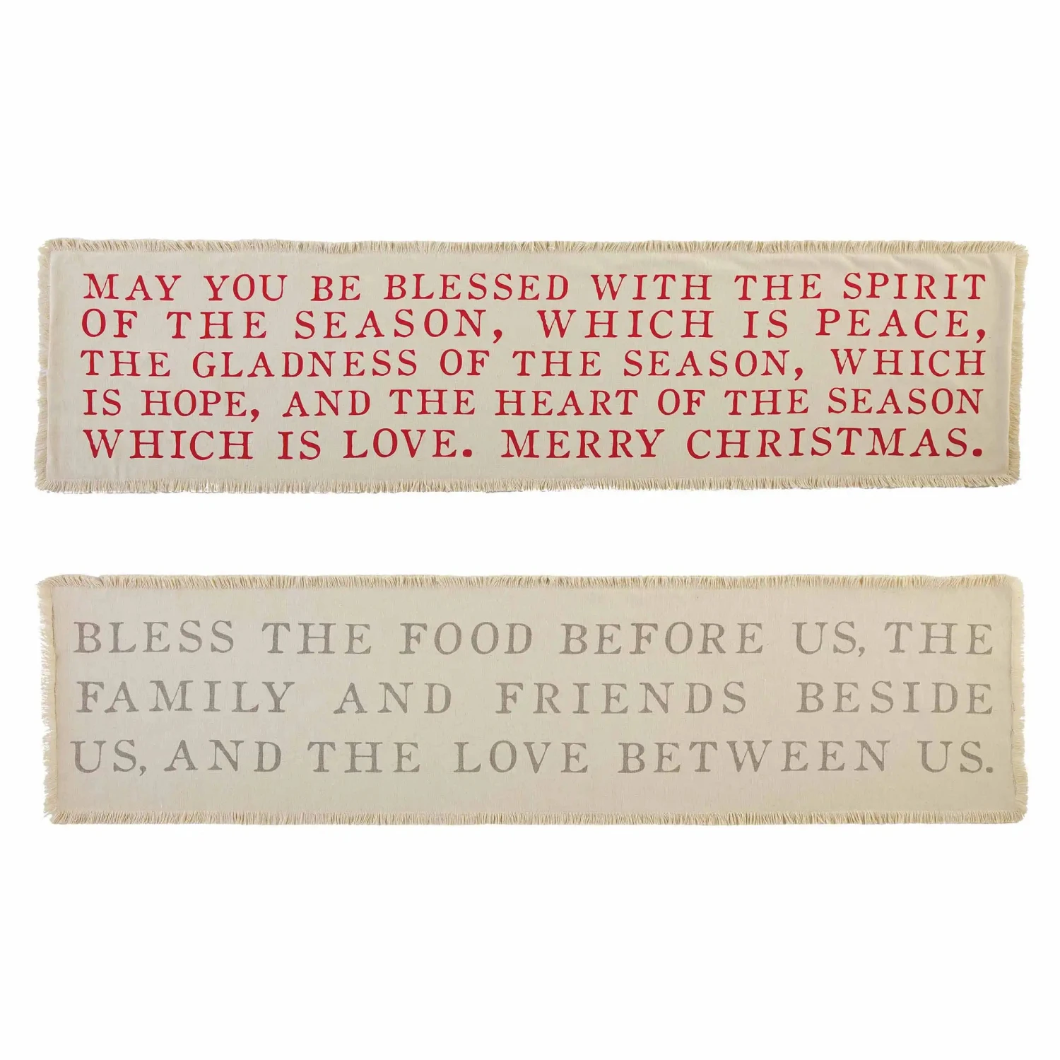 Celebrate the gladness of the season with our Holiday Reversible Table Runner. The reversible table runner is made of washed canvas. The everyday side of the table runner features the sentiment “Bless the food before us, the family and friends beside us, and the love between us”.