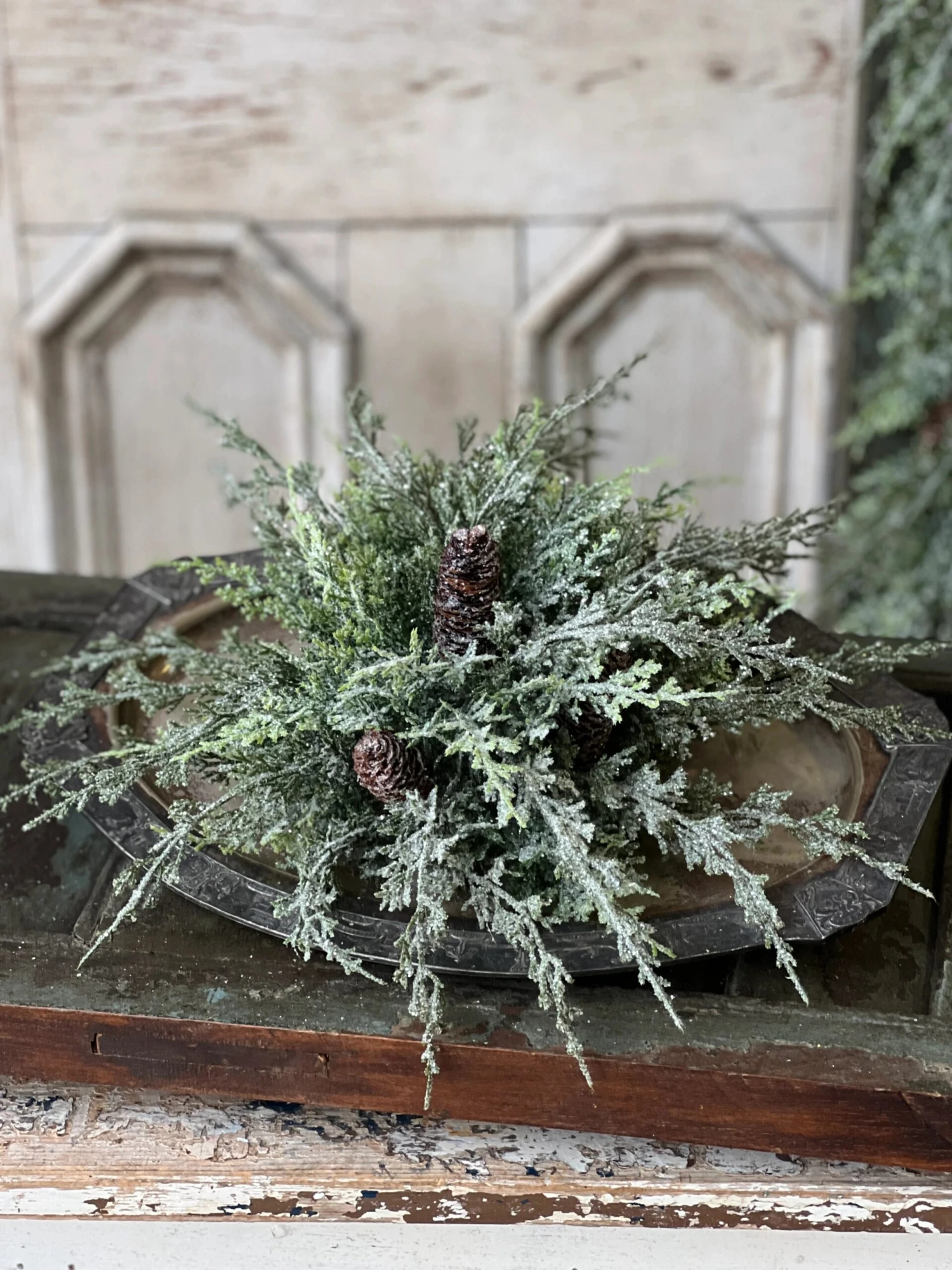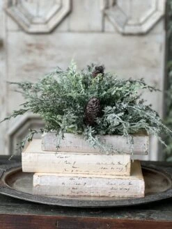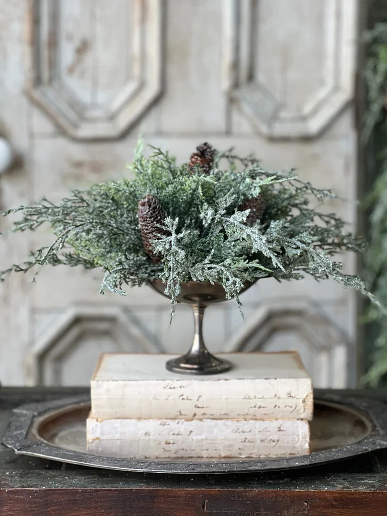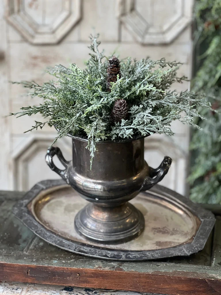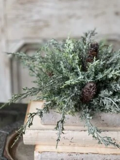 Beautiful and unique, the Silver Thread Cedar is not one to be missed! Snowy structural cedar boughs with a glittery sheen are peppered with natural pine cones. Truly a gorgeous collection that is perfect for winter long use!