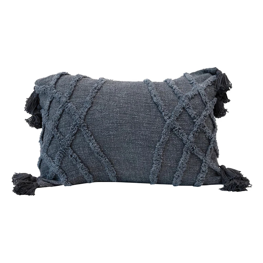 Stonewashed Cotton Blend Slub Pillow With Tufted Pattern & Tassels, Blue