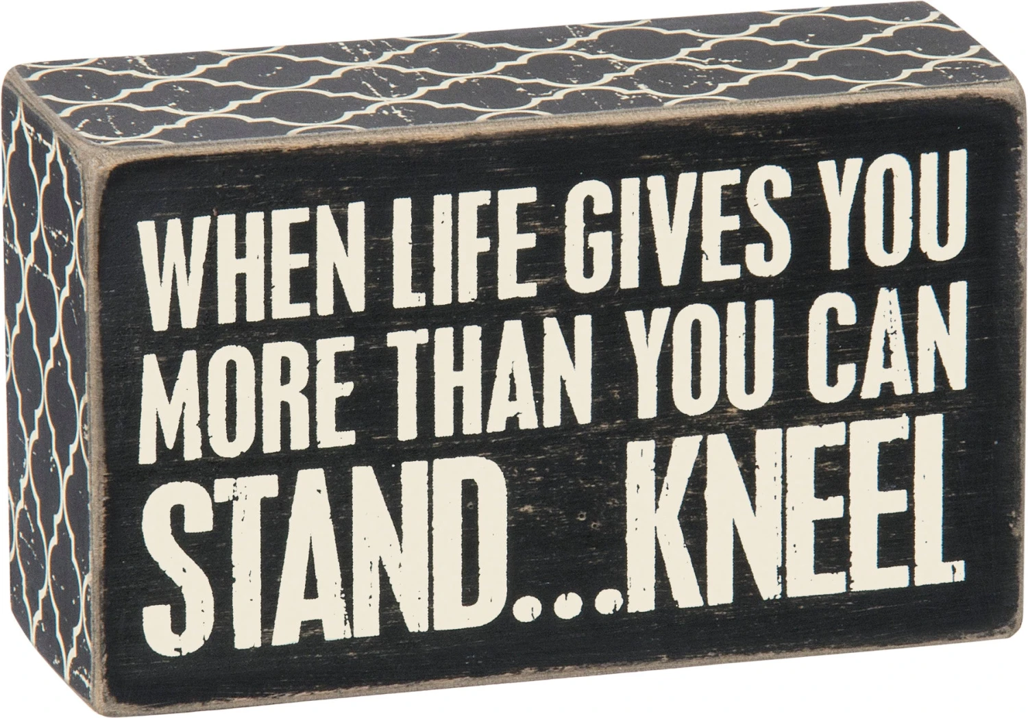 A classic black and white wooden box sign featuring a distressed “When Life Gives You More Than You Can Stand Kneel” sentiment with striped trim designs. Easy to hang or can free-stand alone.