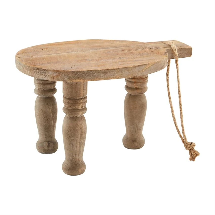 Wooden paddle board with jute rope loop stands on hand-turned riser legs.
