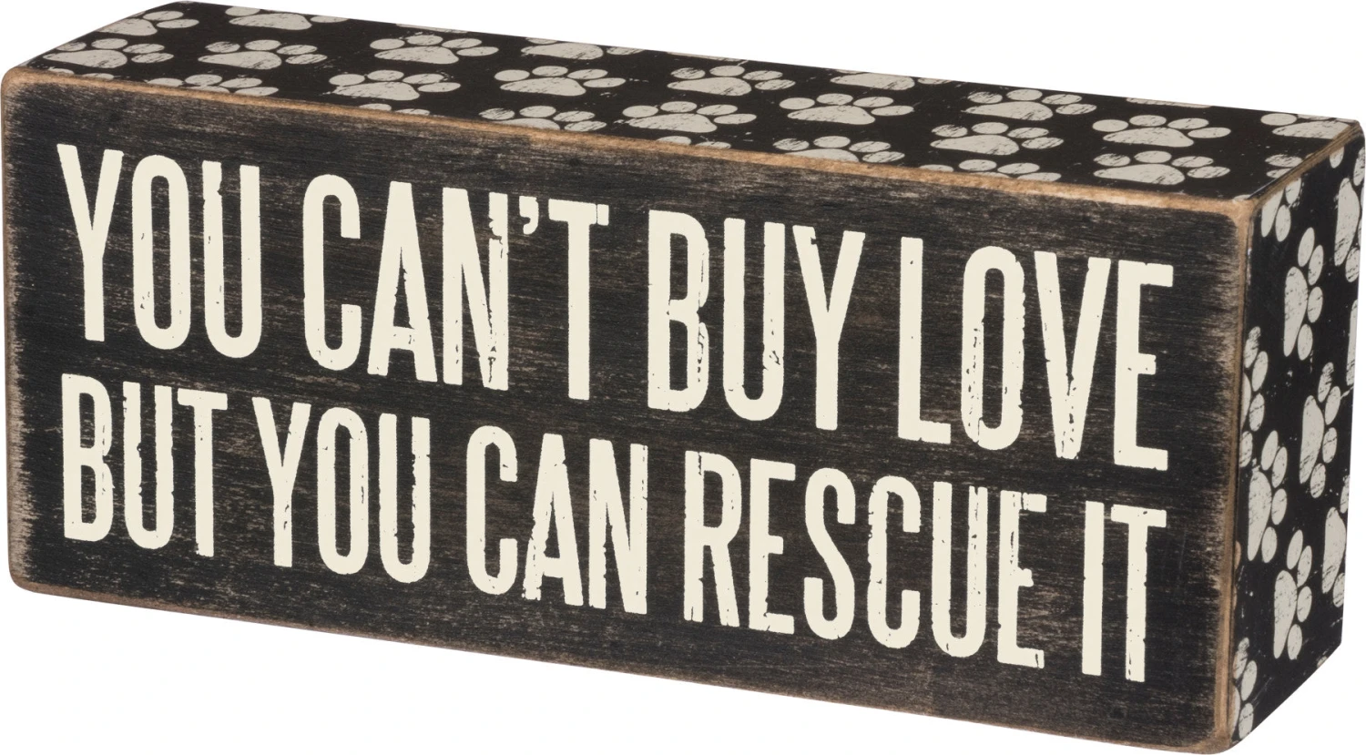 A classic black and white wooden box sign featuring a distressed “You Can’t Buy Love But You Can Rescue It” sentiment with paw print trim designs. Easy to hang or can free-stand alone.